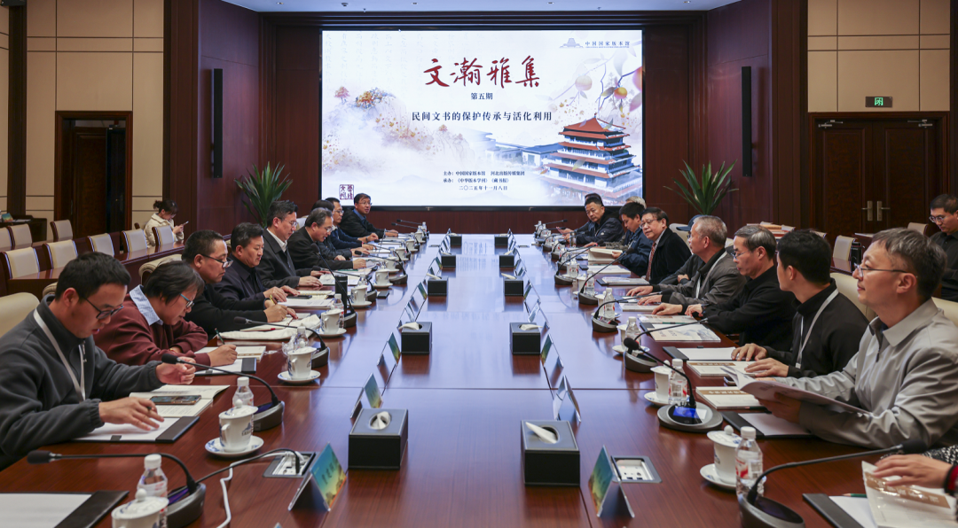 11月8日,“文瀚雅集”第五期在中国国家版本馆中央总馆举办,本期活动主题为“民间文书的保护传承与活化利用”,活动包括珍贵文书资料展示、座谈交流等环节。中国国家版本馆党委书记、馆长刘成勇,中国国家版本馆专家委员会委员、《中华版本学刊》特邀主编李国荣出席,中国国家版本馆副馆长徐中煜主持活动,来自北京、河北、河南、江苏、浙江、福建、广西等地的20余位藏家、专家学者参加活动。