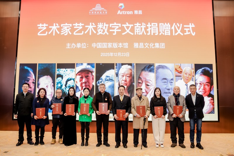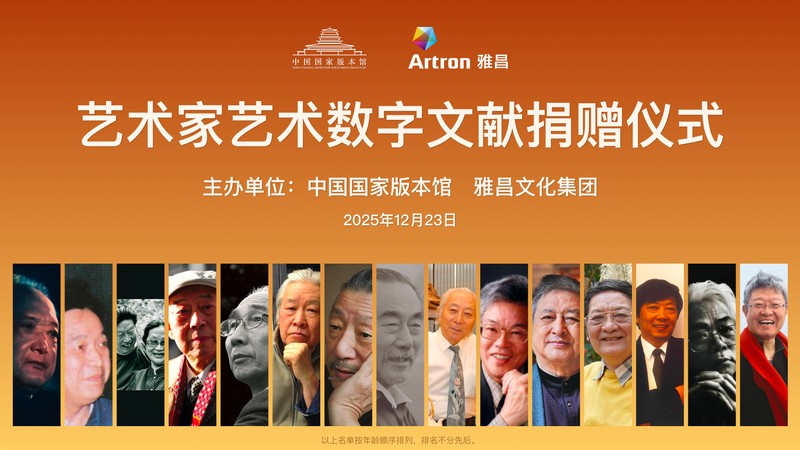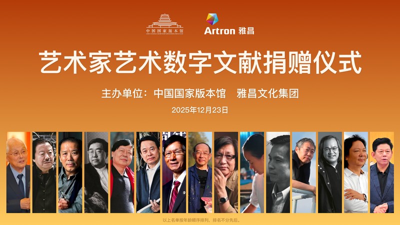 2025年12月23日,中国国家版本馆与雅昌文化集团联合举办的“艺术家艺术数字文献捐赠仪式”在京举行,雅昌文化集团联合众多当代知名艺术家向中国国家版本馆捐赠艺术家艺术数字文献。第十四届全国政协委员、中国国家版本馆党委书记、馆长刘成勇,雅昌文化集团董事长万捷和30多位艺术家共同见证这一文化盛事。