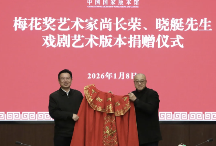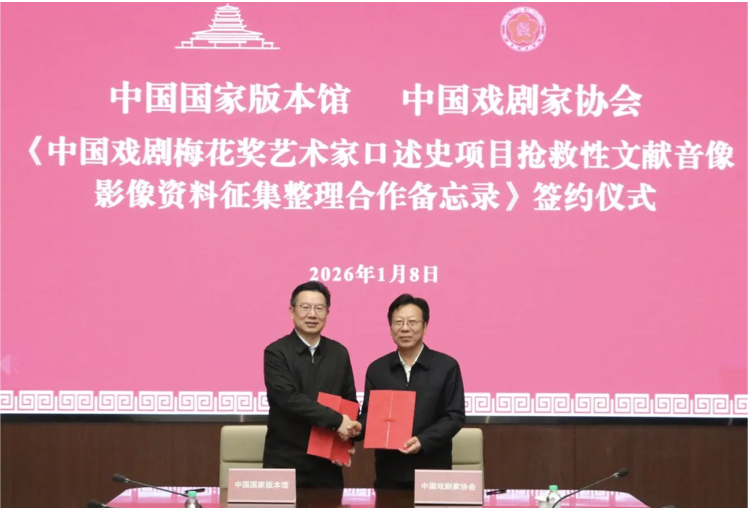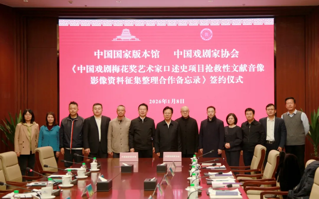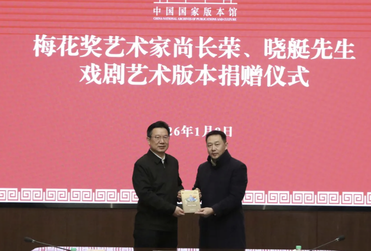 1月8日下午,《中国戏剧梅花奖艺术家口述史项目抢救性文献音像影像资料征集整理合作备忘录》签约仪式暨梅花奖艺术家尚长荣先生、晓艇先生戏剧艺术版本捐赠仪式,在中国国家版本馆文华堂举行。活动由中国戏剧家协会和中国国家版本馆联合主办。