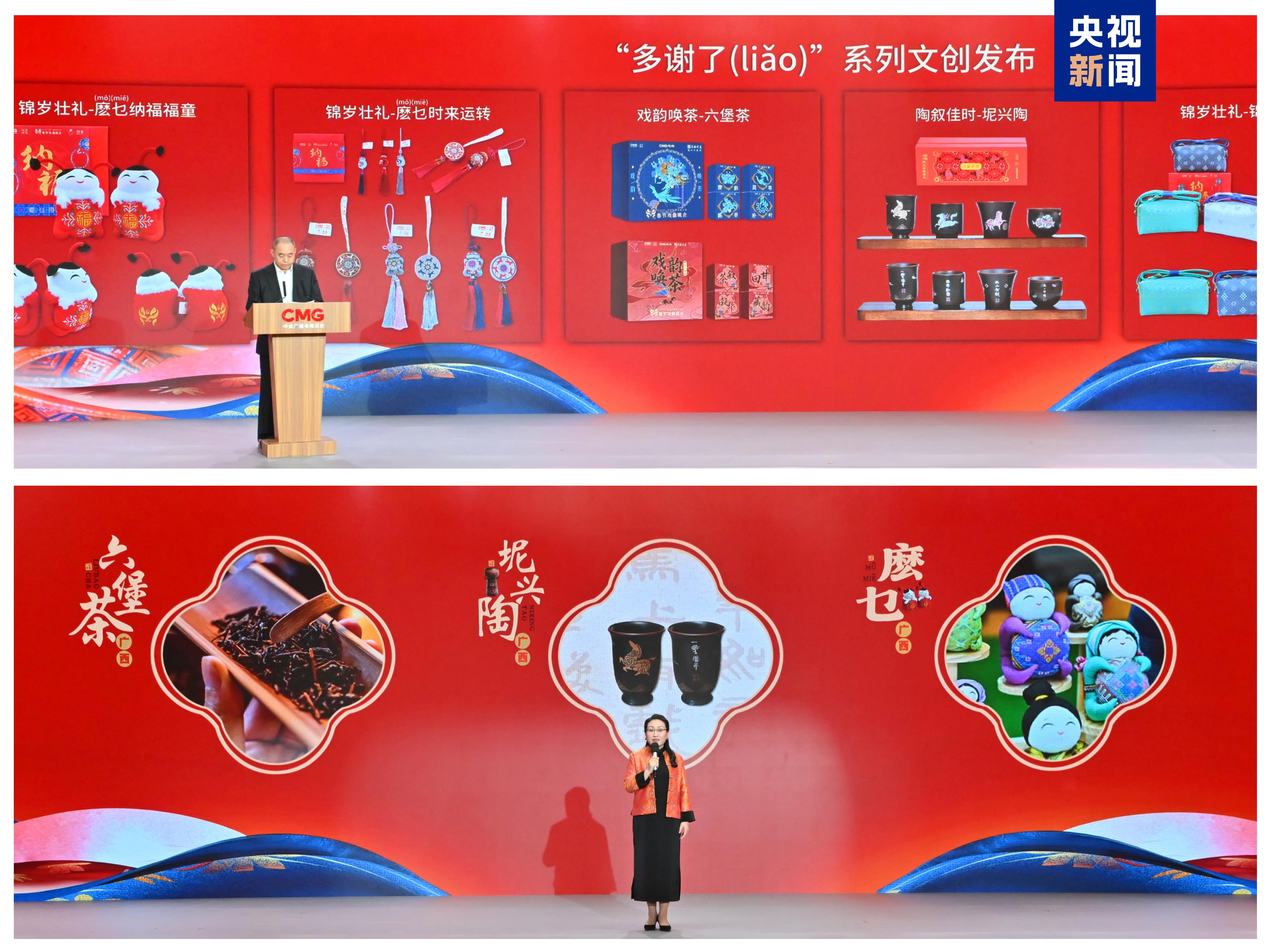晚会特别嘉宾数字人“刘三姐”在活动上亮相,通过AI技术让经典彩调剧绽放新姿。现场还发布了联名文创套装“多谢了[liǎo]”。6款产品以广西刘三姐文化为情感切入点,融合国风戏韵、民族风情和非遗美学,向广大受众送上真挚的新春祝福。